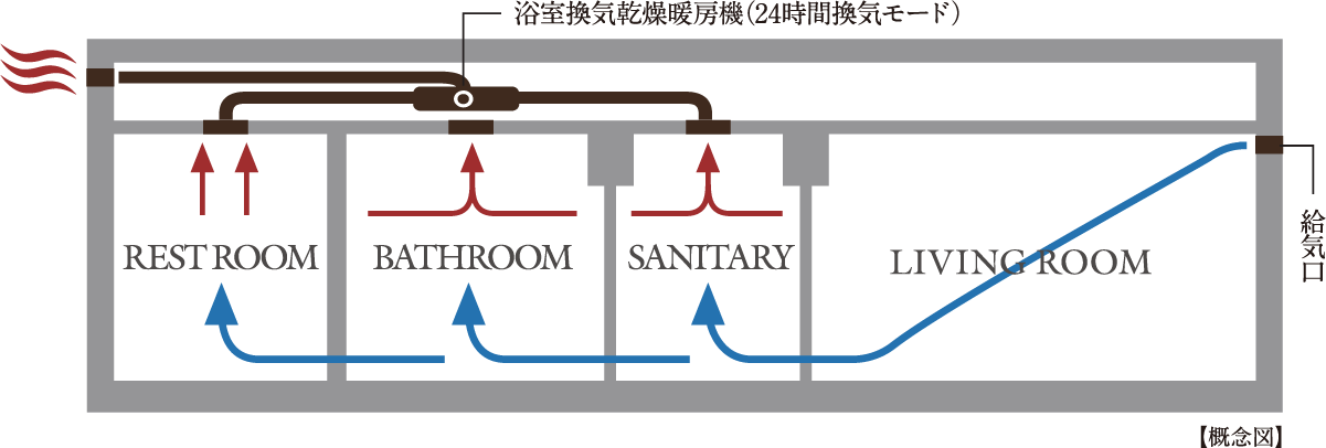 約1時間で室内の空気の約半分を入れ替える24時間微風換気システムを採用。自動的な換気で空気を健やかに保ち、ダニやカビの発生を低減してシックハウス症候群を防ぎます。