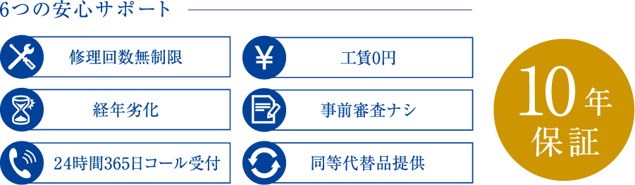 設備機器の故障は、設置5年以降急激に上昇するにも関わらず、空調機器・給湯機器・設備機器メーカー保証期間は、1年程度であるのが現状です。「トラスト住設サポート」は万が一、設備が故障した場合でも、メーカーの保証を延長して無償で修理をご提供するサービスです。