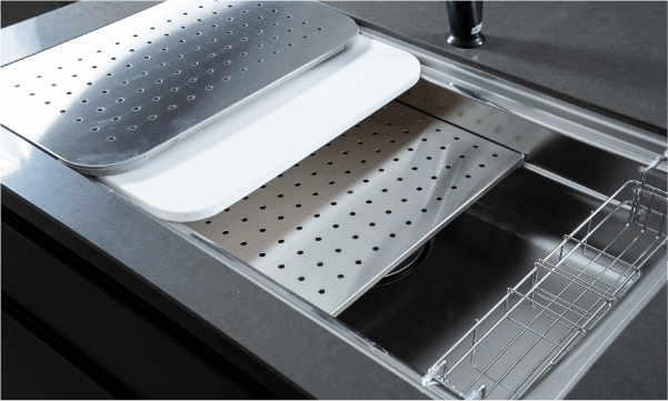 立体的に調理をサポートするユーティリティシンクE。特徴の違う3つの三層シンクが「洗う・調理・片付ける」をスムーズにします。