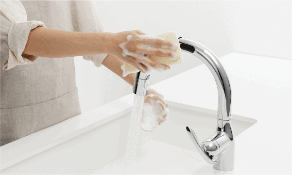ストレスフリーな操作性が魅力のタッチレス水栓を採用。センサーの反応速度は0,6秒と瞬時に水を出し止めできるので、家事の時短はもちろん節水効果も期待できます。