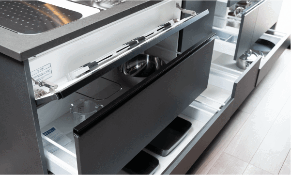 奥まで有効活用できるオールスライド式収納は、内部が見えやすく出し入れ簡単。スムーズに引き出せて優しく閉まるソフトクローズ仕様です。