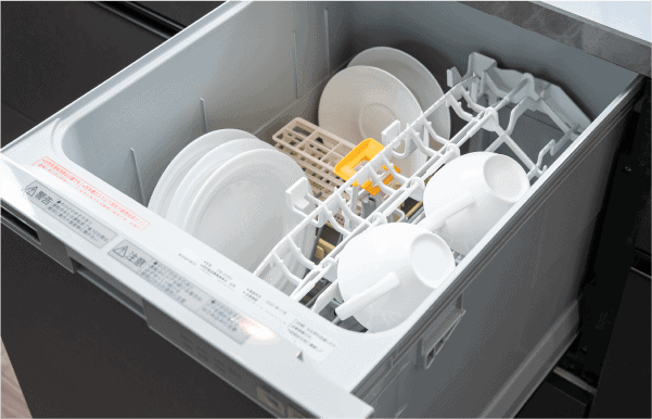 キッチン下に収まるビルトイン食器洗い乾燥機。卓上型の食洗機と異なり、調理や後片付けの動線を邪魔しません。